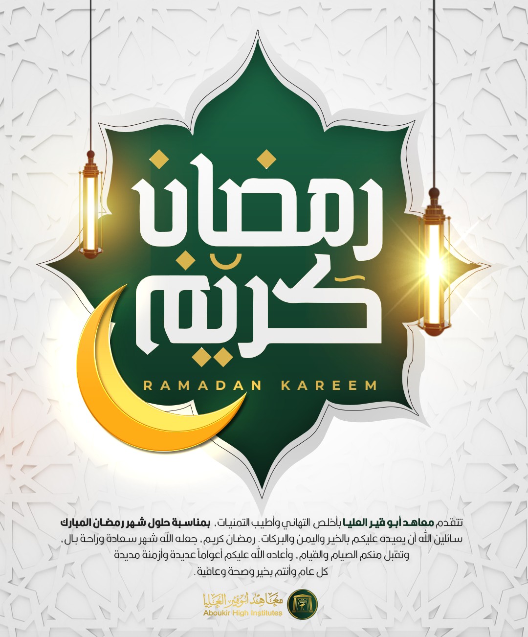 تتقدم معاهد أبو قير العليا بأخلص التهاني وأطيب التمنيات، بمناسبة حلول شهر رمضان المبارك