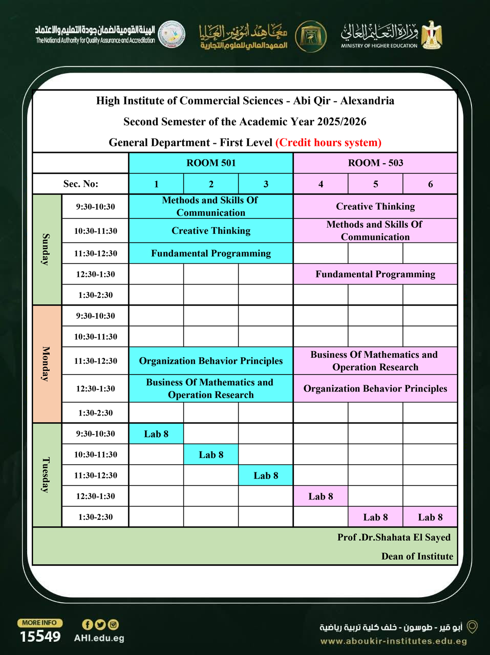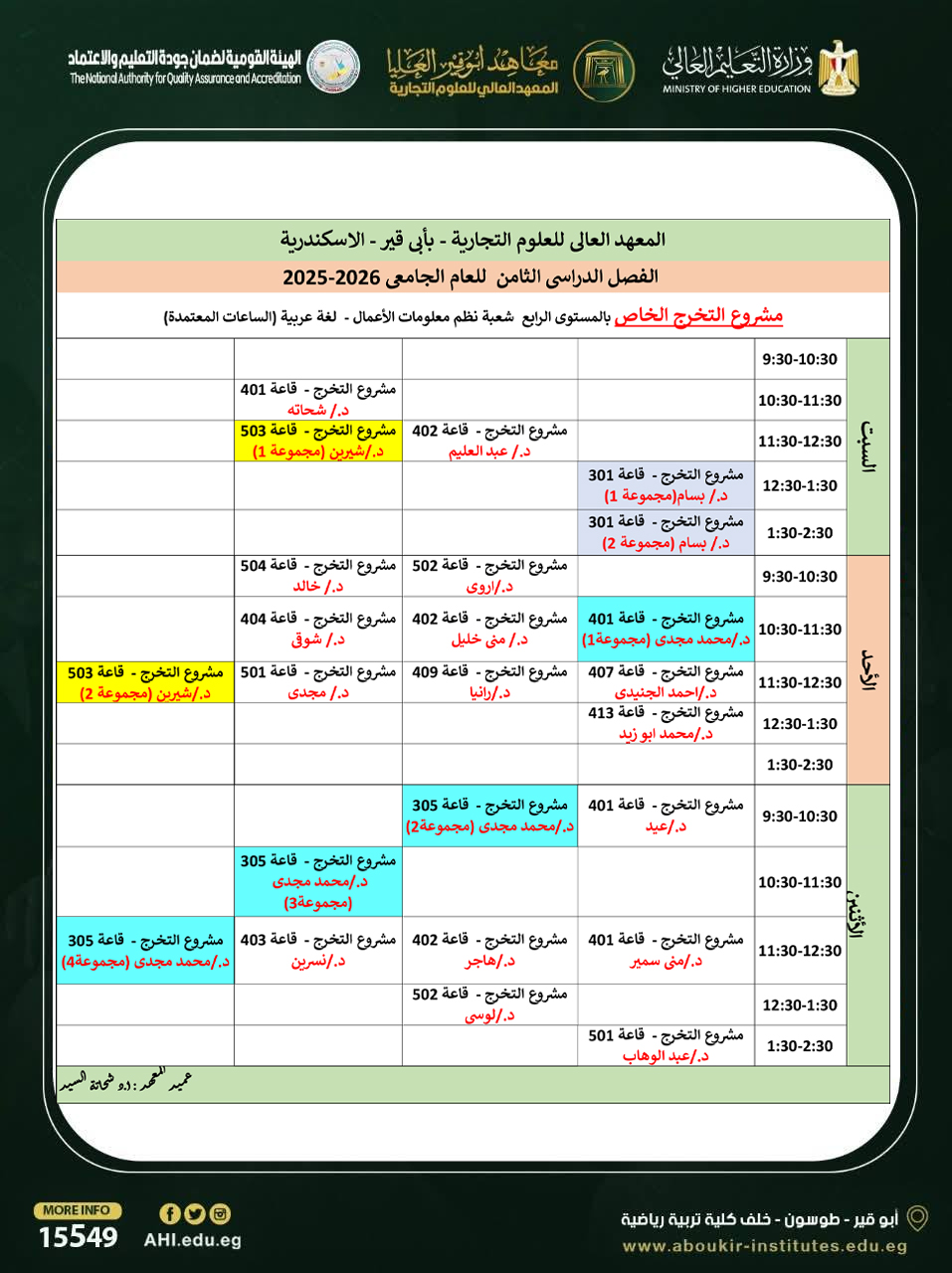 ولقد حققنا نجاحات كثيرة نفخر بها ولا نزال نطمح إلى توفير بيئة تعليمية إيجابية و مثمرة بين أطراف معاهد أبي قير العليا طلاباً و أساتذة وإداريين