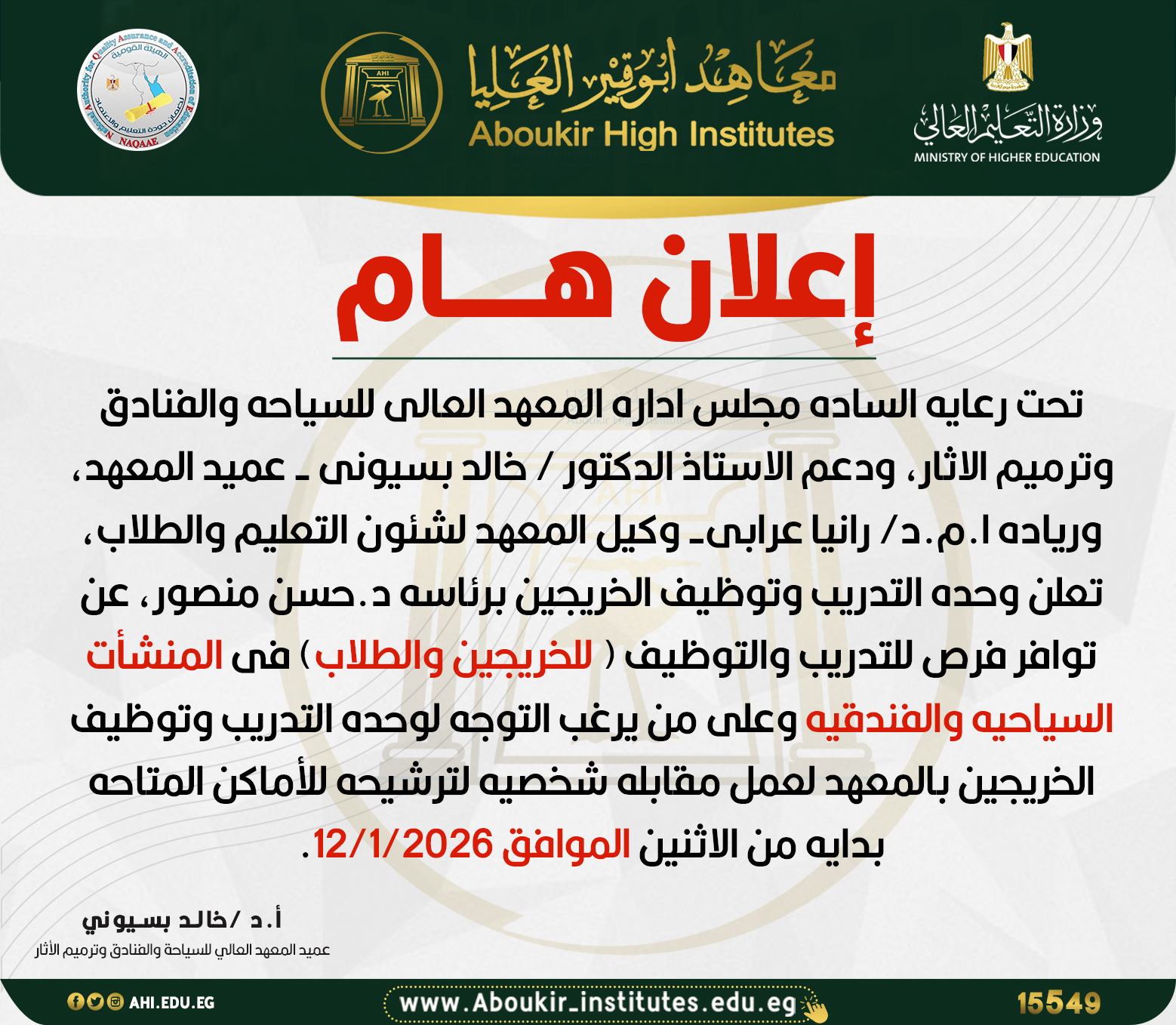 وكي ل خدمة المجتمع وتنمية البيئة بالمعهد العالي للسياحة والفنادق وترميم الآثار |
