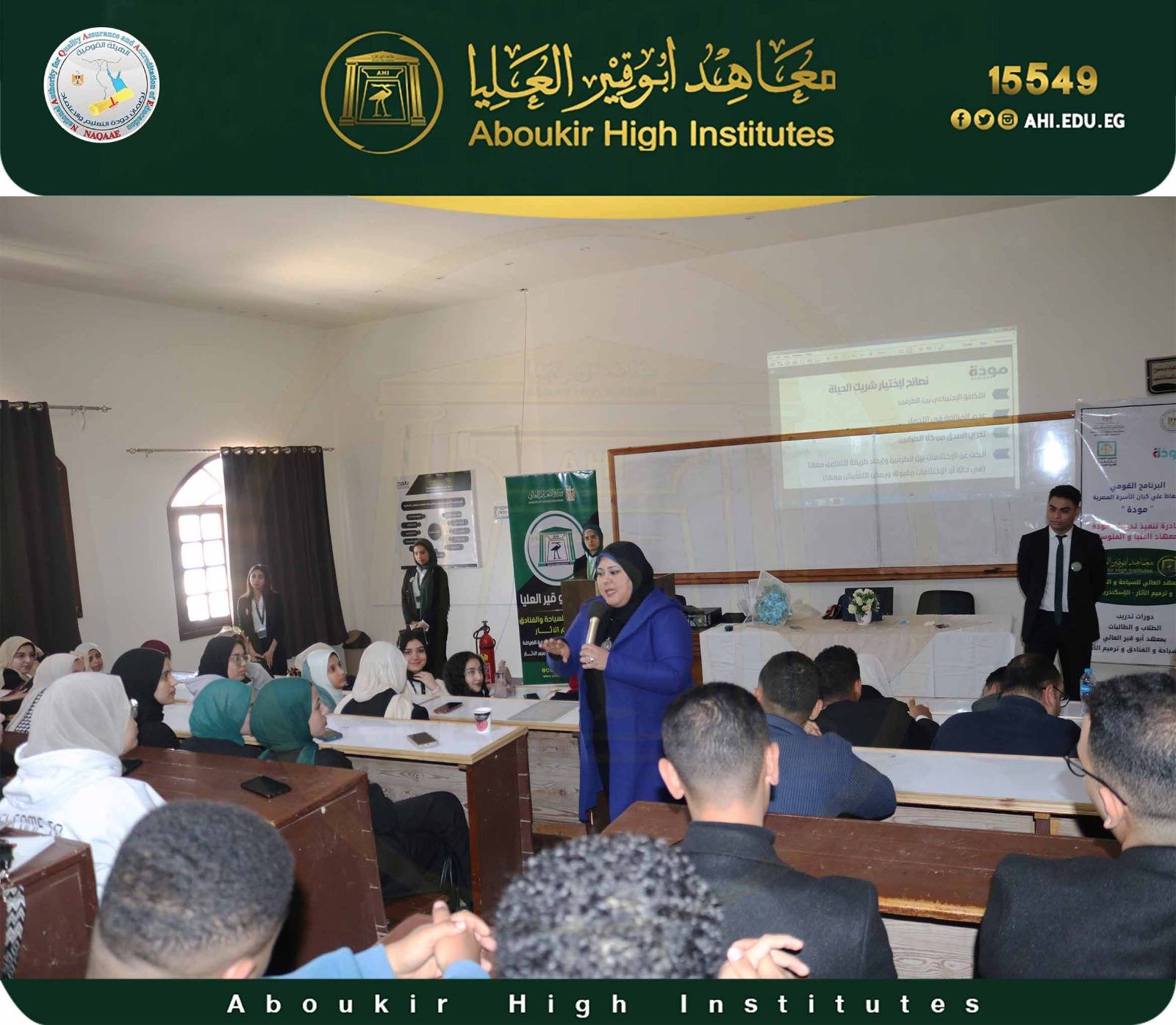 تحت رعاية ودعم مجلس إدارة معاهد أبوقير العليا، والسيد الاستاذ الدكتور خالد بسيونى عميد المعهد العالى للسياحة والفنادق وترميم الآثار وريادة أ٠د رانيا عرابى وكيل المعهد لشئون التعليم والطلاب وفى إطار أنشطة اللجنة الاجتماعية برئاسة د. هند الشافعى تم تنفيذ الدورة التدريبية الأولى للفصل الدراسي الثاني، للمبادرة الرئاسية ( مودة) بالمعهد وذلك في إطار المشروع القومى للحفاظ على كيان الأسرة المصرية وذلك يوم الثلاثاء الموافق ٢٠٢٦/٣/٢٤